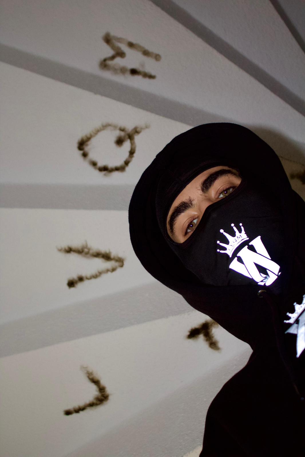 La cagoule LVQM s’inscrit dans une esthétique sombre et affirmée, portée comme un symbole plus qu’un accessoire.